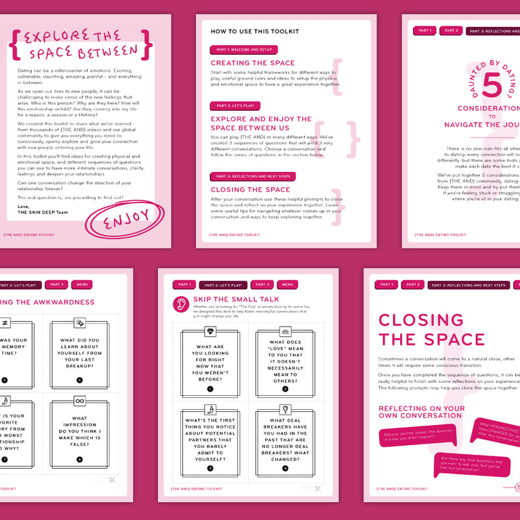 {THE AND} Couples and Dating Toolkits were carefully crafted and packed with prompts, questions, and tools to help you and your partner build a strong foundation of mutual trust, love, passion, and appreciation. Whether you're just starting out or looking to reignite the spark, this toolkit bundle is the perfect resource to get the support and guidance you need on your journey as a couple and help you break down walls and get closer than ever before. So why wait? Download {THE AND} Couples Toolkit Bundle and start building the relationship of your dreams.