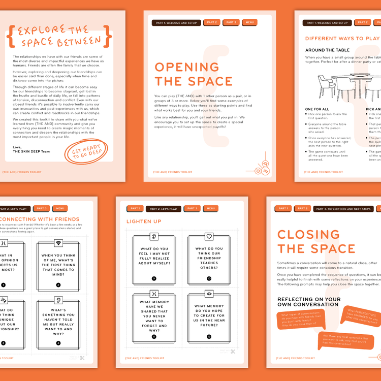 {THE AND} Family and Friends Toolkits were carefully crafted and packed with prompts, questions, and tools to help you and some of the most important people in your life build a strong foundation of connection, honesty, and appreciation.