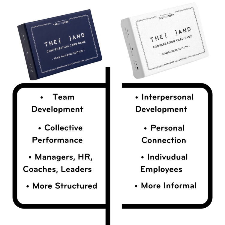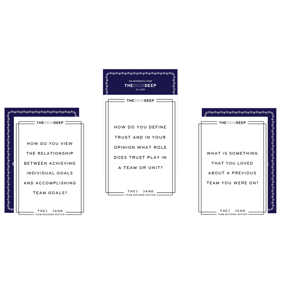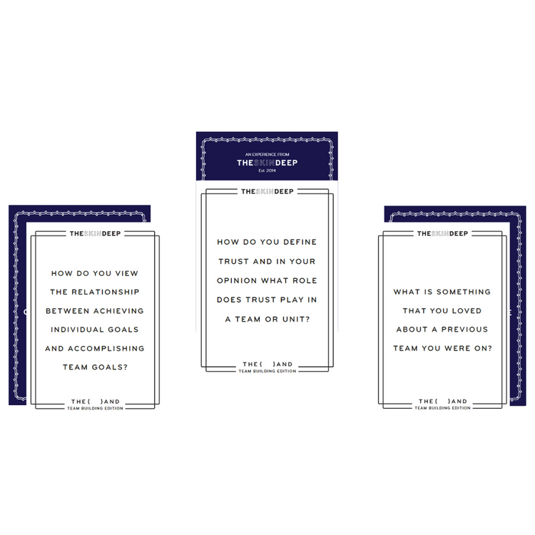 {THE AND} Team Building Edition is your solution. 199 powerful questions and prompts from the question masters at The Skin Deep that will inspire your team to explore what makes them a team, encourage them to have deeper conversations about their shared connections and goals, and strive to be the ultimate team, together.